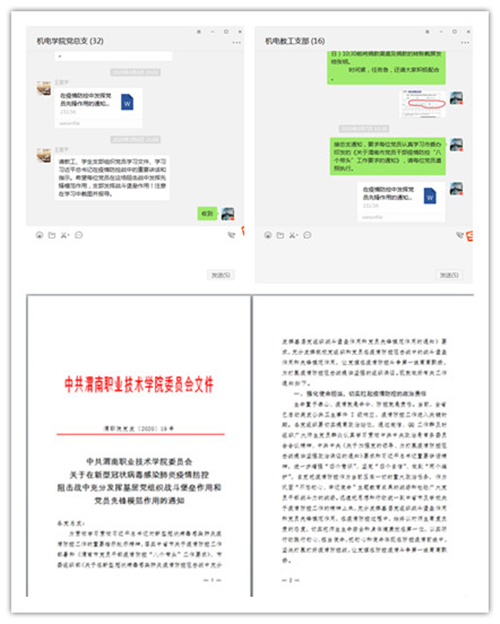 根据公司党委和机电党总支安排,2020年3月7日至3月11日,太阳成集团tyc234cc主页教工支部书记李敏宁利用微信群,组织全体党员同志,在保证是停课不停学,备好课、上好课的前提下,利用课余时间,学习19号文件,认真领会《关于渭南市党员干部疫情防控“八个带头”工作要求的通知》精神。
