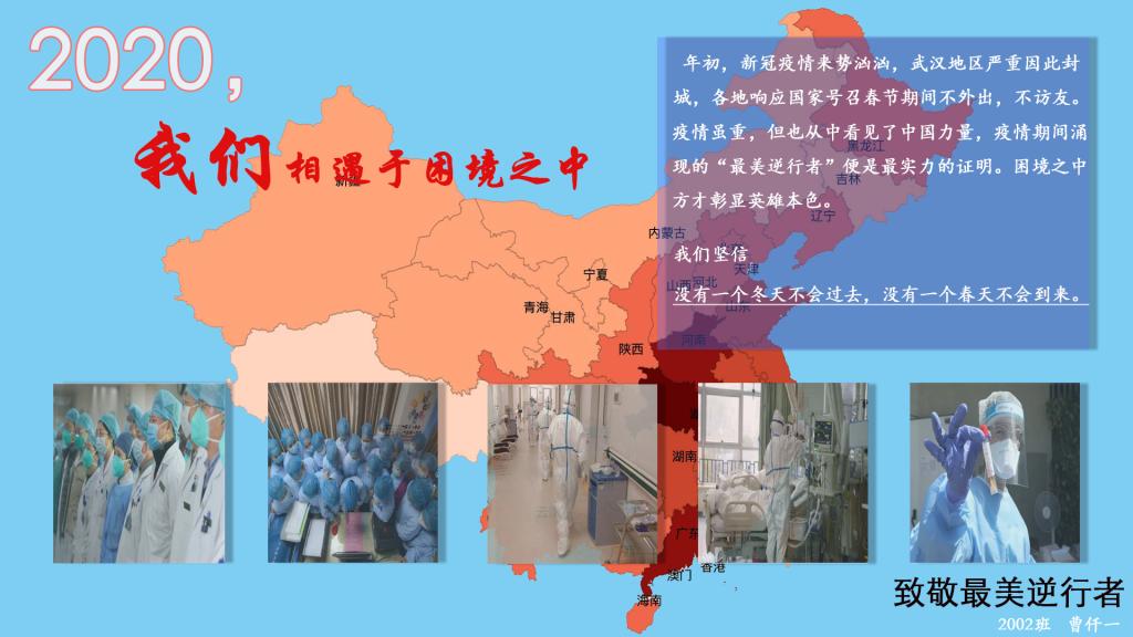 在所有作品中,最让人印象深刻的就是一副写着“致敬逆行者”字样的红色画面,白衣天使们身着厚重的防护服带着防护面具,走着相反的方向,即便是严峻的疫情他们也丝毫没有退缩的意思。他们的身影是寒冬里的一股暖流,是他们用执着和坚守诠释着爱的奉献。