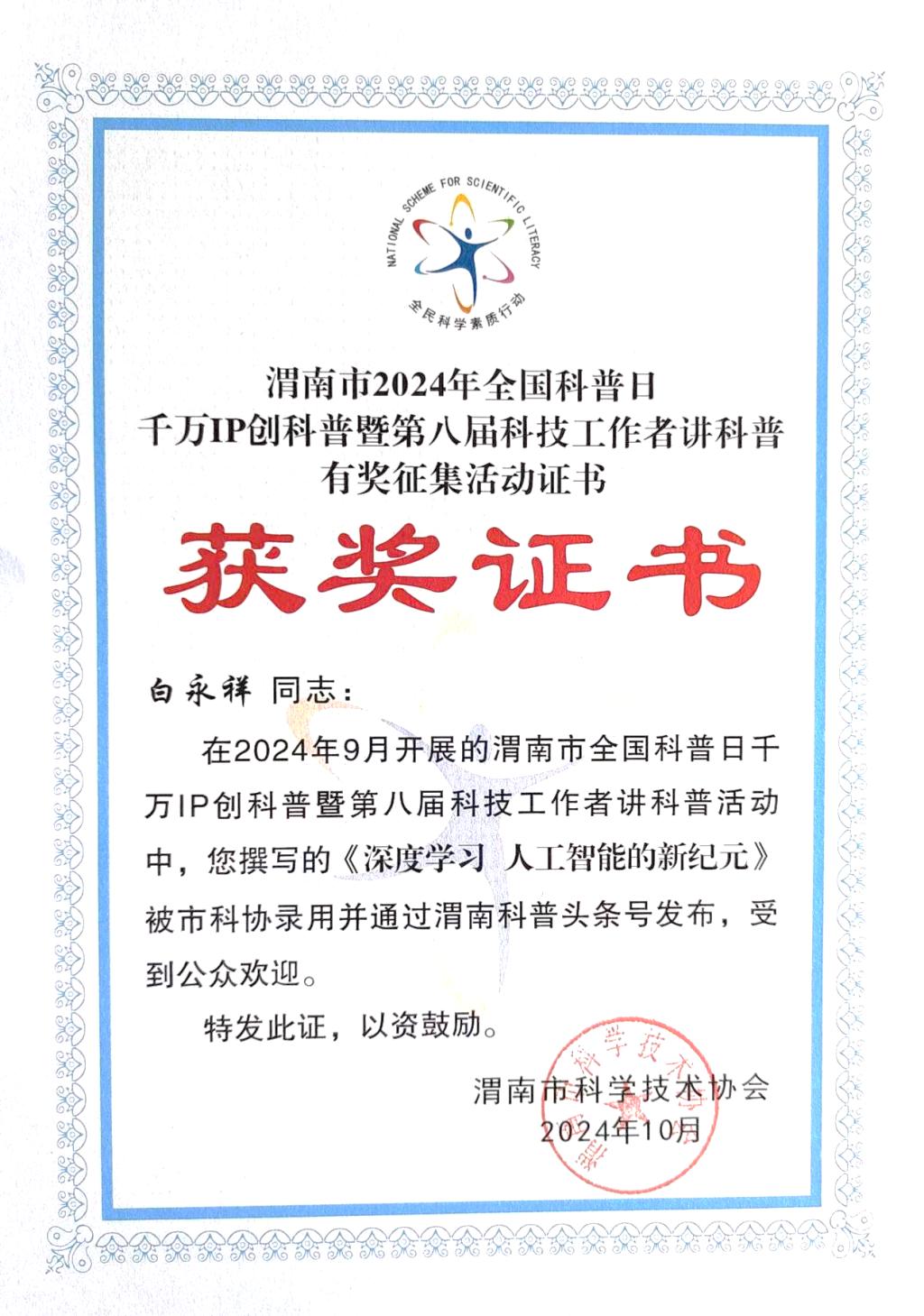 花开有时,灼灼其华。在渭南市2024年全国科普日千万IP创科普暨第八届科技工作者讲科普有奖征集活动中,太阳成集团tyc234cc主页教师白永祥教授创作的《深度学习 人工智能的新纪元》科普作品被市科协录用并通过渭南科普头条号发表。此次获奖,充分反映了公司持续发挥人才资源优势,积极面向社会公众开展科普活动所取得的显著成效。