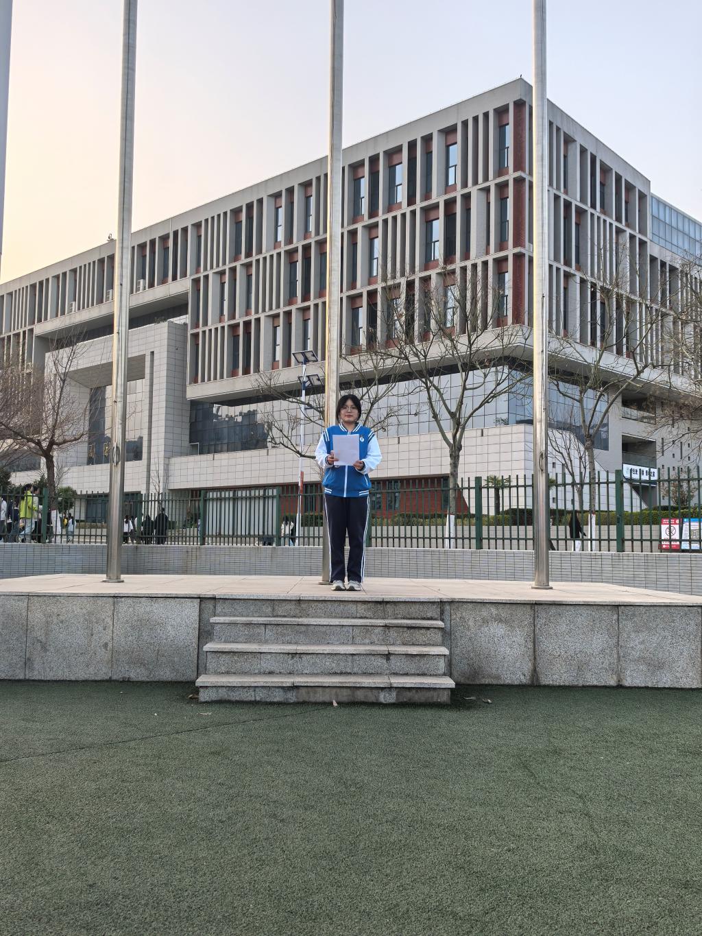 随着激昂的国歌响起,升旗手有力地扬起国旗,五星红旗缓缓升起,与旭日初升时倾洒的耀眼光芒相互辉映。在场师生齐声高唱国歌。那激昂的旋律回荡在校园上空,震撼着每一个人的心灵,唤起了大家内心深处对祖国的无限热爱与敬意。尽管清晨有丝丝凉意,但每个人的眼神都专注而坚定,心中的热情足以点燃春天的蓬勃希望。